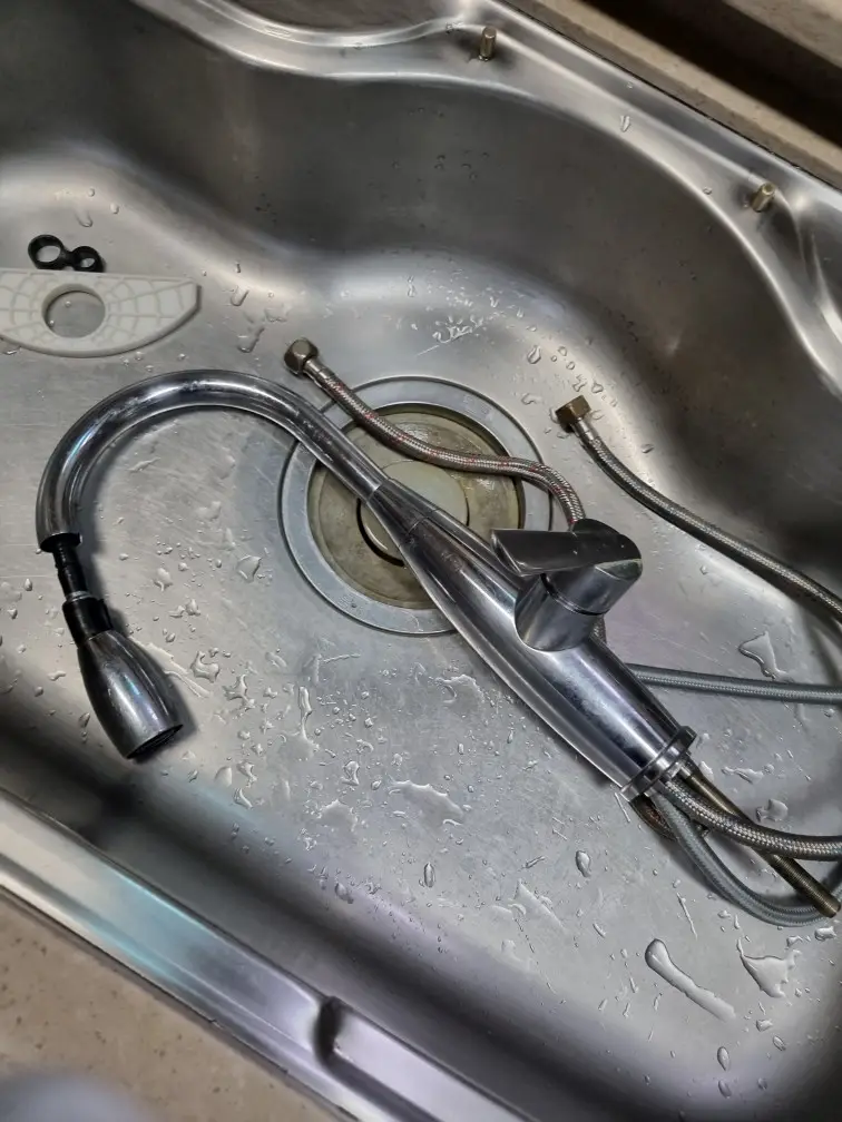 먼저 싱크대 하부의 급수 밸브를 잠가 물을 차단했습니다. 이 과정을 건너뛰면 작업 중 물이 쏟아져 나올 수 있습니다. 그다음 기존 수전을 분해했습니다. 싱크대 하부에서 고정 너트를 풀고 급수 호스를 분리했습니다.